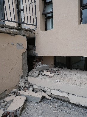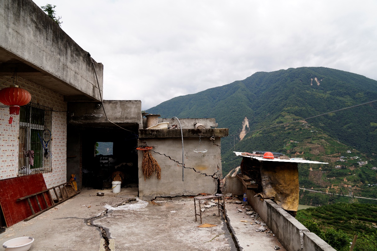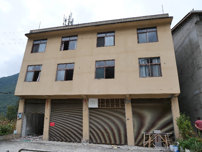 石棉線科考組(戴君武、周寶峰、柏文)圍繞51SMX,SC-T2471,51SMM等強震臺站,開展周邊建筑震害調查。SC-T2471臺站在本次地震中記錄到的加速度記錄峰值最大,現場考察發現該臺站位于山包之上,地形對其地震響應具有較為明顯的放大作用。此外,地基失效是造成房屋破壞的重要原因,由于山地地形限制,部分民房建于山坡上,地震時結構基礎土體沿山坡向下發生滑動,造成基礎局部失效,進而引起上部結構破壞。