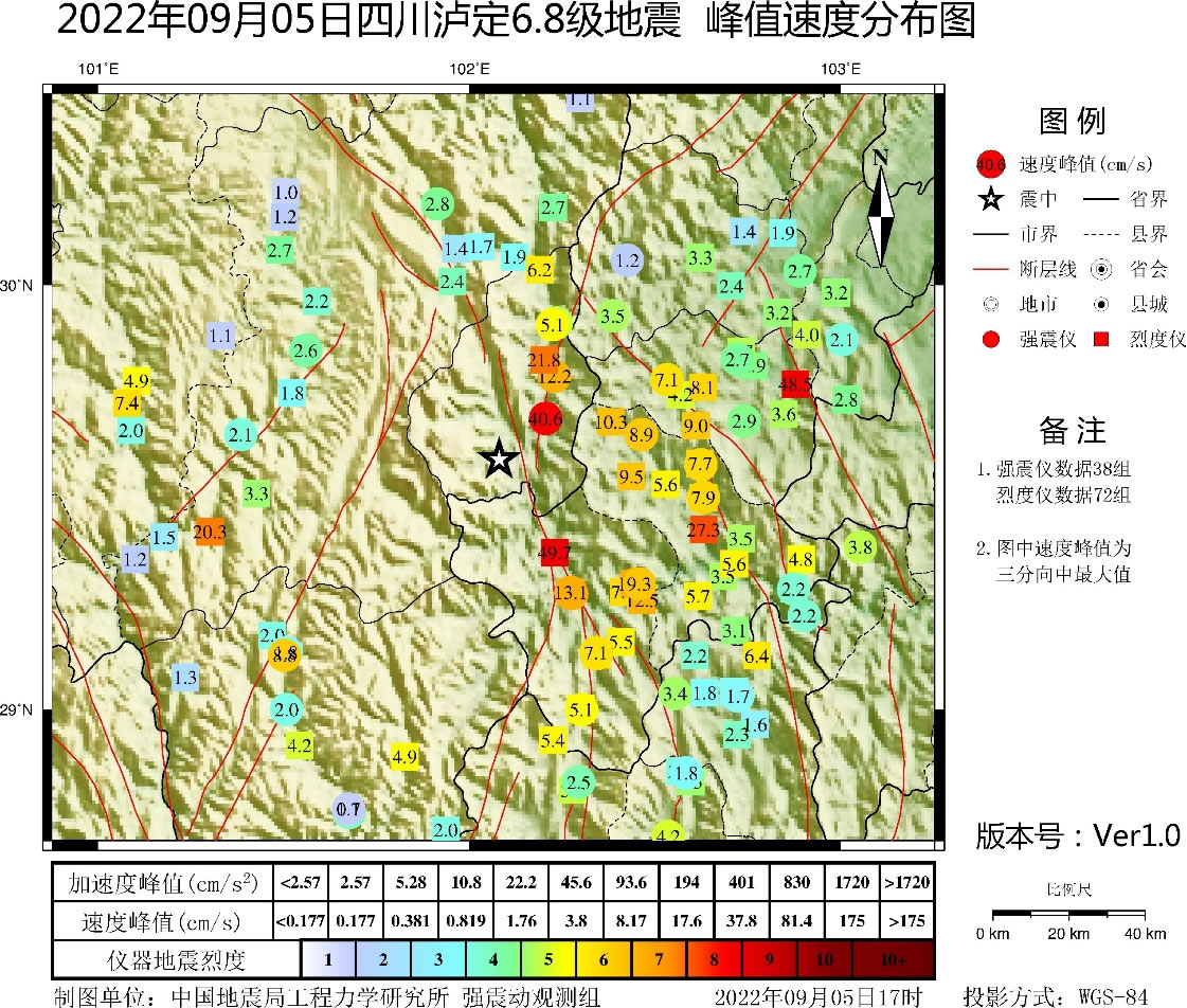 四川瀘定6.8級(jí)地震峰值速度分布圖(單位:cm/s)