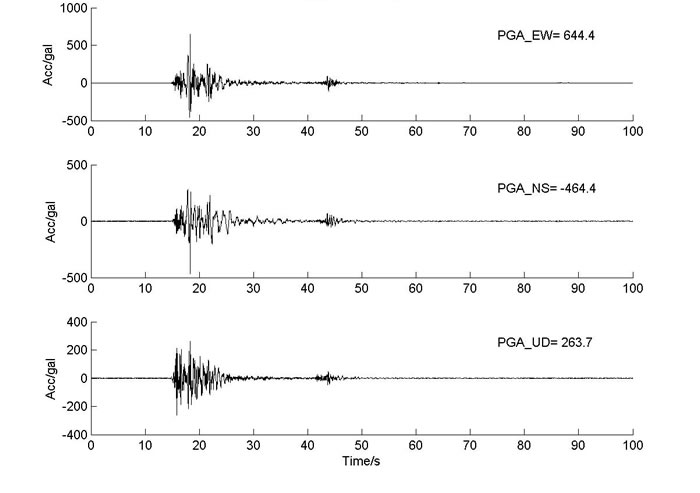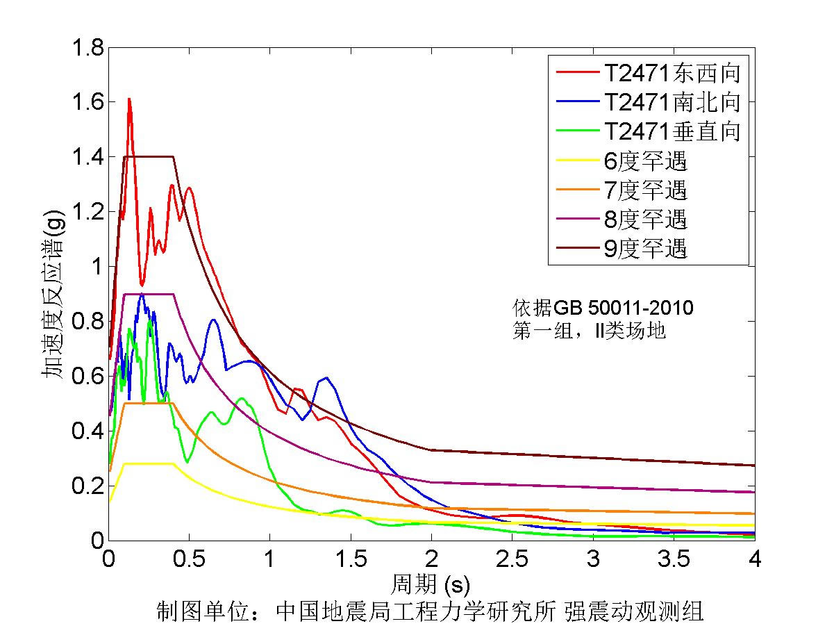 此次獲取的記錄,距離震中最近的51LDJ臺(tái)震中距16.2公里,東西向峰值加速度超過0.32個(gè)重力加速度,儀器地震烈度8.7度,T2471臺(tái)震中距為28.3km,東西峰值加速度超過0.64個(gè)重力加速度,儀器地震烈度9.1度。