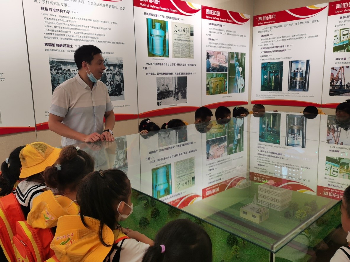 講座結束后,張昊宇博士帶領學生們進行了一系列的科普實驗。首先是參觀鐵路地震監測預警系統展臺,講解地震后該系統如何保障高鐵安全運行的原理;其次回答學生關于“中國古建筑為何能夠跨越千年不倒”的問題,為學生講解中國傳統木結構的抗震機理;最后進行的微型振動臺模擬實驗和搖擺墻結構無損倒塌模型實驗是活動中學生們最喜歡的環節,每一位學生都親手操作搖擺墻結構無損倒塌模型,近距離直觀的認識到不同建筑結構抗震能力的強弱區別,學習了建筑結構抗震的基本知識。