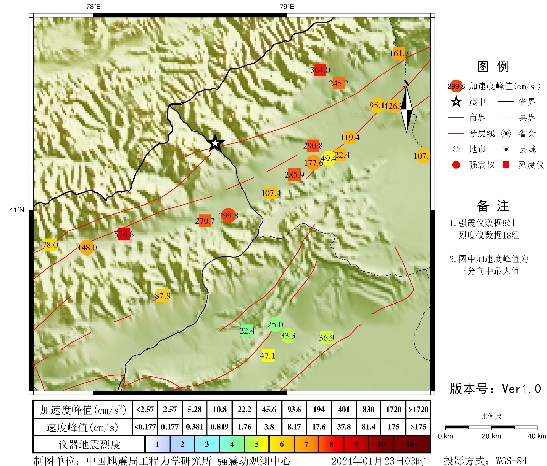 圖2新疆烏什7.1級地震峰值加速度分布圖(單位:cm/s2)