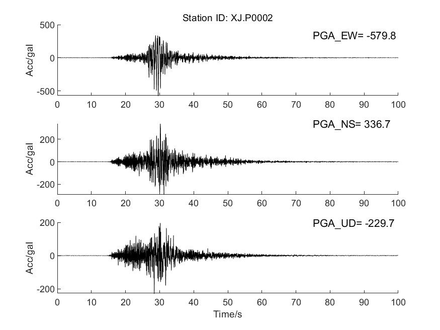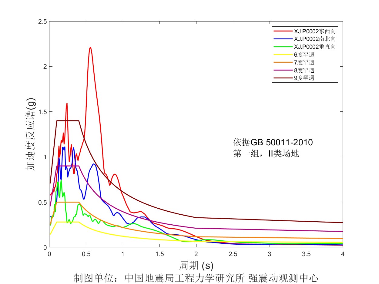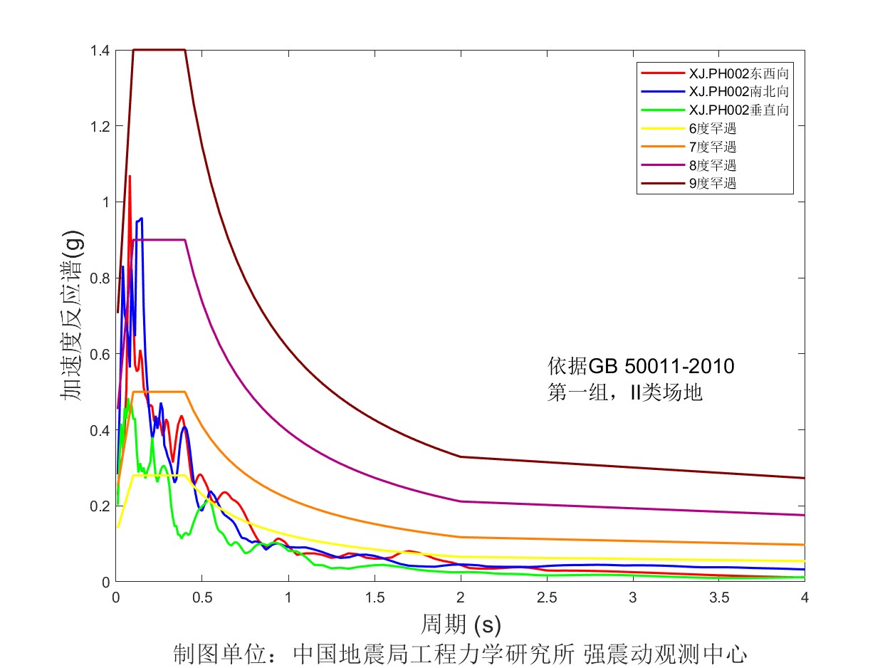 地震后工力所強震動觀測中心共收取距震中100公里范圍內實時強震儀記錄8組、烈度儀記錄18組,繪制了此次地震的儀器地震烈度(圖1)、峰值加速度(圖2)、峰值速度空間分布圖(圖3),以及典型記錄的時程曲線和反應譜(圖4-7),供應急參考。