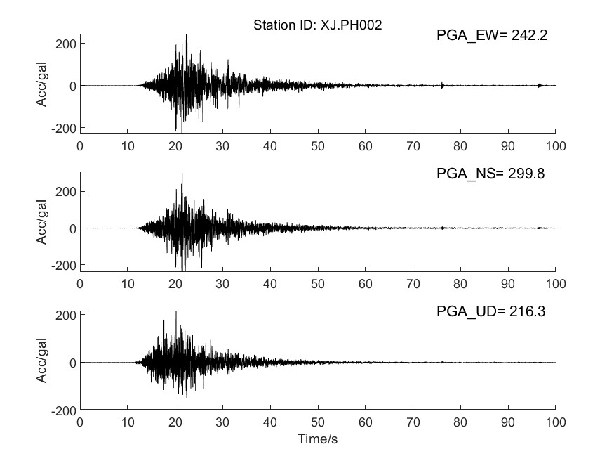 此次地震距震中56 km的P0002 臺峰值加速度最大,加速度峰值為576.6 cm/s2(東西向),速度峰值為47.3 cm/s(東西向),儀器地震烈度8.9度;PH002臺距震中最近,震中距32 km,加速度峰值為299.8 cm/s2(南北向),速度峰值為13.1 cm/s(南北向),儀器地震烈度7.5度。