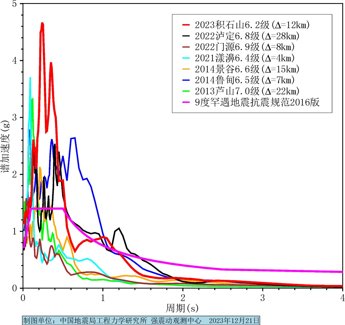 工力所強震動觀測中心共收集距震中100公里范圍內57個實時強震儀和182個實時烈度儀的加速度觀測記錄。提取了記錄的峰值加速度(Peak Ground Acceleration,PGA)。圖1為臺站的水平向峰值加速度分布圖,其中烈度儀GS.N0028距震中12.3公里,峰值加速度高達1.1 g(g為重力加速度),遠超過當地抗震設計基本地震動峰值加速度;計算的儀器地震烈度為9.2度,遠大于烈度儀所在區域的抗震設防烈度。其余各站點加速度、速度記錄及反應譜等數據分析圖表均可見中國地震局工程力學研究所 應急產出:甘肅積石山6.2級地震(第2報) (iem.ac.cn),供進一步參考。